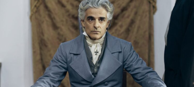 Μάλιστα ως προς την ιδεολογική και πολιτική απόκλιση των δύο είναι χαρακτηριστική η σκηνή με τον διάλογο των αντρών στην ύπαιθρο όπου αναδεικνύεται ανάγλυφα αφενός ο αλτρουιστής Καποδίστριας και αφετέρου ο τεχνοκράτης Μέτερνιχ. Πιο συγκεκριμένα ο Έλληνας κυβερνήτης ενστερνίζοντας τις αρχές και αρετές του φιλανθρωπισμού και του Δικαίου ζητά από τον Αυστριακό βασιλιά την πολιτική ενσυναίσθησή του και την ευσυνειδησία του καθώς ο ελληνικός λαός είναι ένας χιλιο-ταλαιπωρημένος λαός που επί της ουσίας αναζητά ελευθερία. Απεναντίας ο Μέτερνιχ υπερασπίζοντας σθεναρά και αδιαπραγμάτευτα την πολιτική απολυτότητα εκφράζει ότι το Δίκαιο ορίζουν μόνο οι ισχυροί. Αξίζει να σημειωθεί ότι ο Καποδίστριας σε αυτήν την σκηνή δεν προβάλλεται ως αφελής πολιτικός που ζητά συναδέλφωση από τον πολιτικό του αντίπαλο. Γνωρίζει πολύ καλά ότι ο Μέτερνιχ ήταν και είναι καίριος αντίζηλός του. Αντίθετα αναδεικνύεται το ψυχικό και συναισθηματικό μεγαλείο του Καποδίστρια μέσα από την κινηματογραφική τέχνη και οι ώριμες φιλειρηνικές του πεποιθήσεις. Ο ίδιος δεν αντιλαμβάνεται τον Ελληνικό λαό ως κατώτερο των άλλων και επιλέγει ακόμη και σε έναν σκληρό, αμοραλιστή, βίαιο, αυταρχικό βασιλιά να δώσει το δικαίωμα εξιλέωσης.